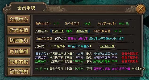 答:【黄金会员】待遇:每天可以领取258游戏币,所有版本打怪爆率+100%!